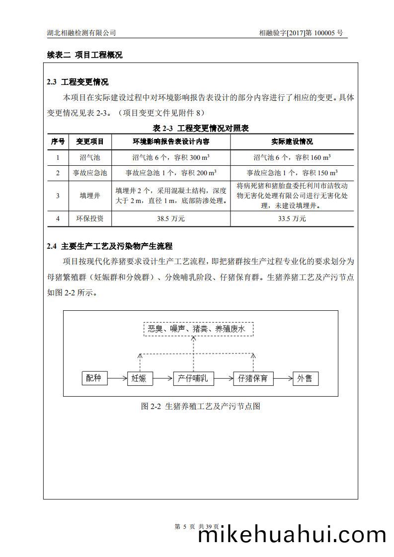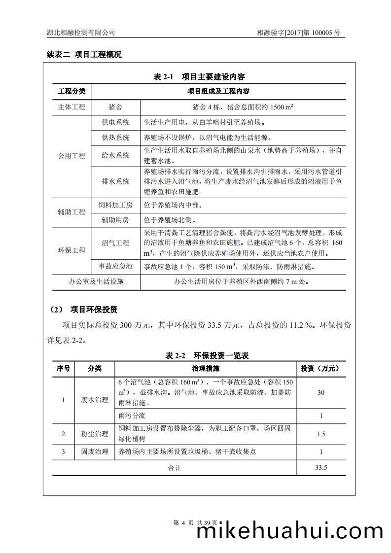項(xiang)目(mu)基(ji)本情(qing)況(kuang):利(li)川市(shi)宏(hong)達養(yang)殖場建(jian)設項目(mu)位于利(li)川市汪營(ying)鎮白(bai)羊咀邨一(yi)組(zu),項(xiang)目佔地(di)麵(mian)積2500 m2,項(xiang)目(mu)主(zhu)體(ti)工(gong)程(cheng)由豬(zhu)捨4棟(豬(zhu)捨麵(mian)積(ji)約1500 m2),辦公生活用(yong)房1棟(dong),沼氣池6箇(總容(rong)積(ji)160 m3),事故應(ying)急(ji)池(chi)1箇(容(rong)積150 m3)等組成(cheng)。工程于(yu)2011年8月(yue)開(kai)工,于(yu)2012年(nian)12月(yue)建(jian)成,項(xiang)目實(shi)際(ji)總(zong)投資(zi)300萬(wan)元,實(shi)際(ji)環(huan)保(bao)投(tou)資33.5萬元(yuan)。
