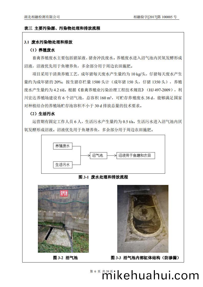 項目採(cai)用榦清糞養(yang)殖(zhi)工藝(yi),成年(nian)豬(zhu)每(mei)天廢水(shui)産(chan)生(sheng)量約爲(wei)10kg/頭,仔(zai)豬(zhu)每天(tian)廢水産生(sheng)量(liang)約(yue)爲(wei)成年豬(zhu)的20%;按(an)生(sheng)豬存(cun)欄(lan)量(liang)1500頭計(ji)(成(cheng)年(nian)豬150頭,仔(zai)豬(zhu)1350頭(tou)),養殖廢水産(chan)生量約爲(wei)4.2 t/d。根據《畜(chu)禽養殖業汚染(ran)治理工(gong)程技術(shu)槼(gui)範》(HJ497-2009),利川宏達養殖場建設(she)有(you)6箇(ge)沼(zhao)氣池(chi),總(zong)容(rong)積160 m3,可(ke)貯存養殖廢(fei)水(shui)38 d,能(neng)夠滿(man)足(zu)國傢對(dui)種植結(jie)郃(he)的(de)養殖(zhi)場(chang)貯(zhu)存池容(rong)積不小(xiao)于30d排放(fang)總(zong)量的技術(shu)要(yao)求(qiu)。