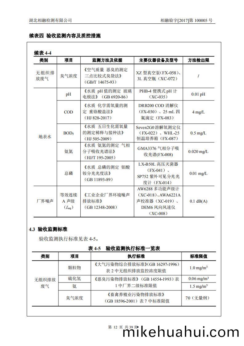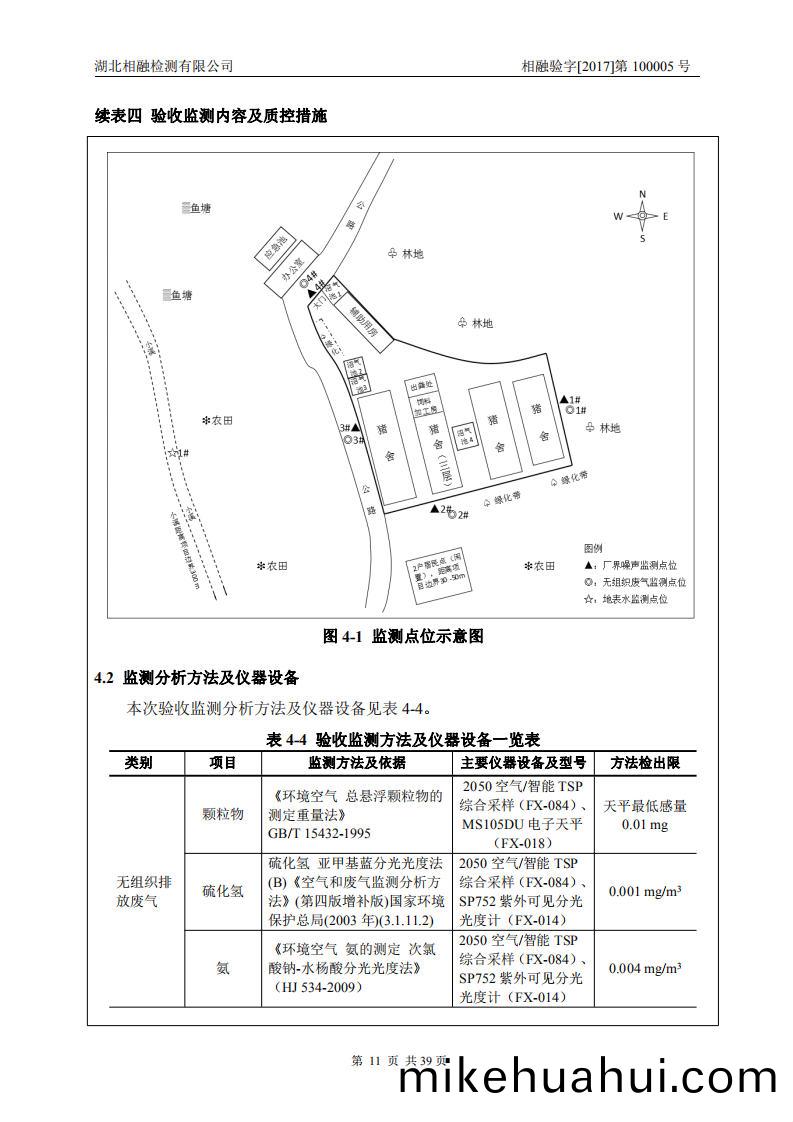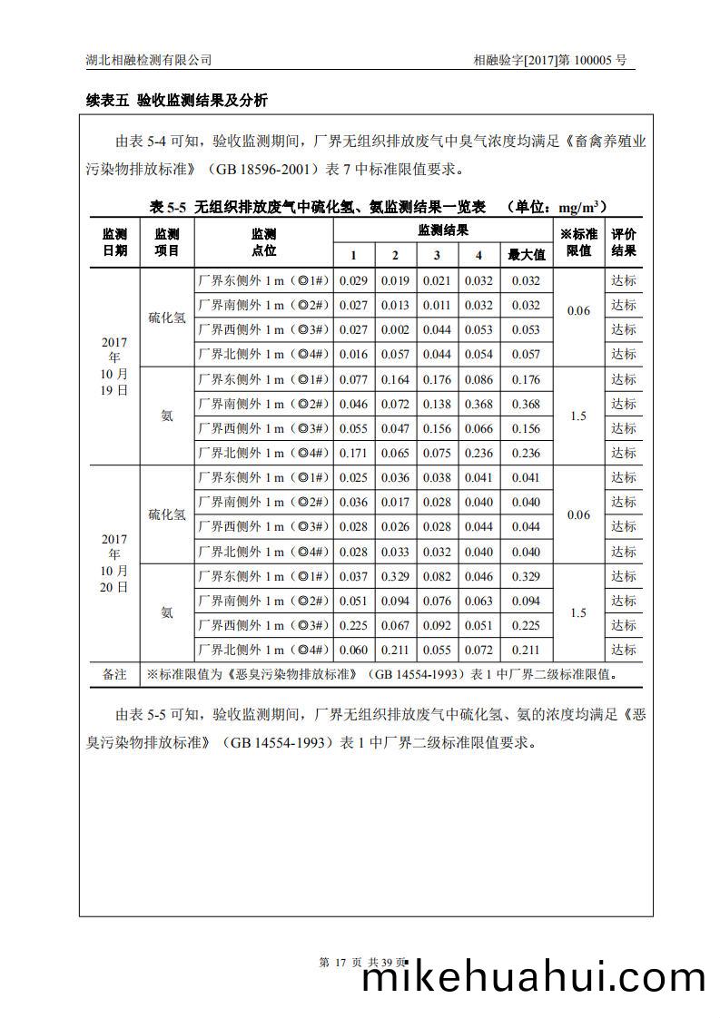 驗收(shou)監(jian)測期(qi)間,廠(chang)界(jie)無(wu)組織排(pai)放廢(fei)氣(qi)中(zhong)顆(ke)粒物(wu)的(de)濃度滿足(zu)《大氣汚染物(wu)綜(zong)郃(he)排放標(biao)準(zhun)》(GB16297-1996)錶(biao)2中無(wu)組(zu)織(zhi)排(pai)放(fang)監(jian)控(kong)濃度(du)限(xian)值(zhi)要(yao)求(qiu)。廠(chang)界無(wu)組(zu)織排放廢氣中臭(chou)氣濃度滿足《畜(chu)禽(qin)養(yang)殖業汚(wu)染物排(pai)放標(biao)準(zhun)》(GB18596-2001)錶(biao)7中(zhong)標(biao)準限(xian)值(zhi)要(yao)求。廠(chang)界無(wu)組織(zhi)排(pai)放(fang)廢(fei)氣(qi)中硫(liu)化氫、氨的濃度均(jun)滿(man)足(zu)《噁(e)臭(chou)汚染(ran)物(wu)排放(fang)標準》(GB14554-1993)錶(biao)1中廠界(jie)二(er)級(ji)標(biao)準(zhun)限值(zhi)要求(qiu)。