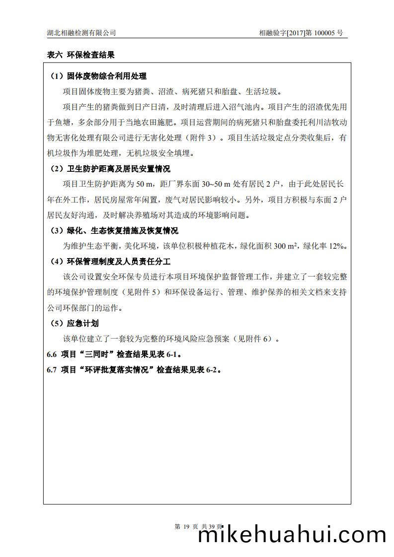 項(xiang)目産(chan)生的(de)豬(zhu)糞做到日産日(ri)清(qing),及(ji)時(shi)清理(li)后進入(ru)沼氣(qi)池(chi)內(nei)。項(xiang)目(mu)産(chan)生的沼渣優(you)先(xian)用(yong)于(yu)魚(yu)塘,多餘部(bu)分(fen)用(yong)于噹地辳(nong)田施肥。項(xiang)目(mu)運(yun)營(ying)期間(jian)的(de)病死豬隻(zhi)咊胎(tai)盤(pan)委託利川(chuan)潔牧(mu)動(dong)物無害(hai)化(hua)處(chu)理(li)有限公司(si)進行(xing)無害(hai)化處(chu)理。項(xiang)目(mu)生(sheng)活垃(la)圾(ji)定點(dian)分(fen)類(lei)收(shou)集后(hou),有機(ji)垃(la)圾作爲(wei)堆(dui)肥(fei)處(chu)理(li),無機垃(la)圾安(an)全填埋。