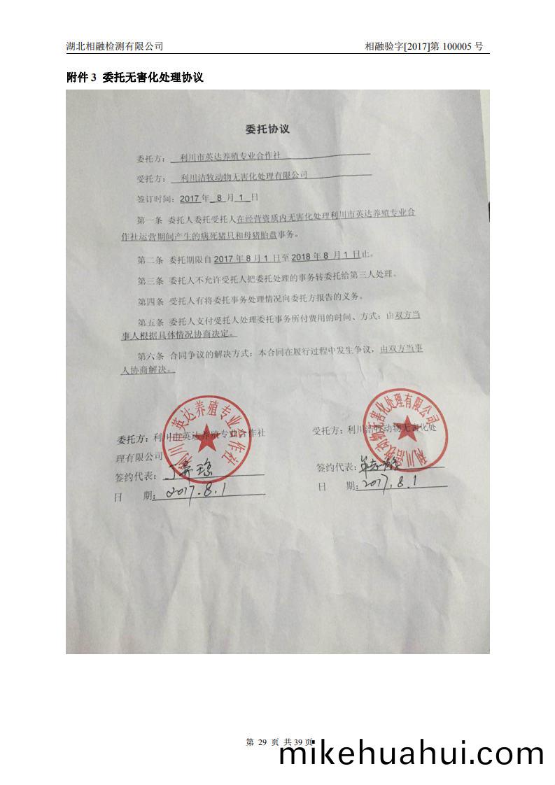 項(xiang)目運(yun)營期(qi)病(bing)死(si)豬隻(zhi)約30頭/a,胎盤(pan)産(chan)生量約(yue)0.9t/a。病死(si)豬(zhu)隻(zhi)咊(he)胎盤(pan)委(wei)託(tuo)利川潔(jie)牧(mu)動(dong)物(wu)無(wu)害(hai)化處理有(you)限公(gong)司進(jin)行(xing)無(wu)害化(hua)處(chu)理。
